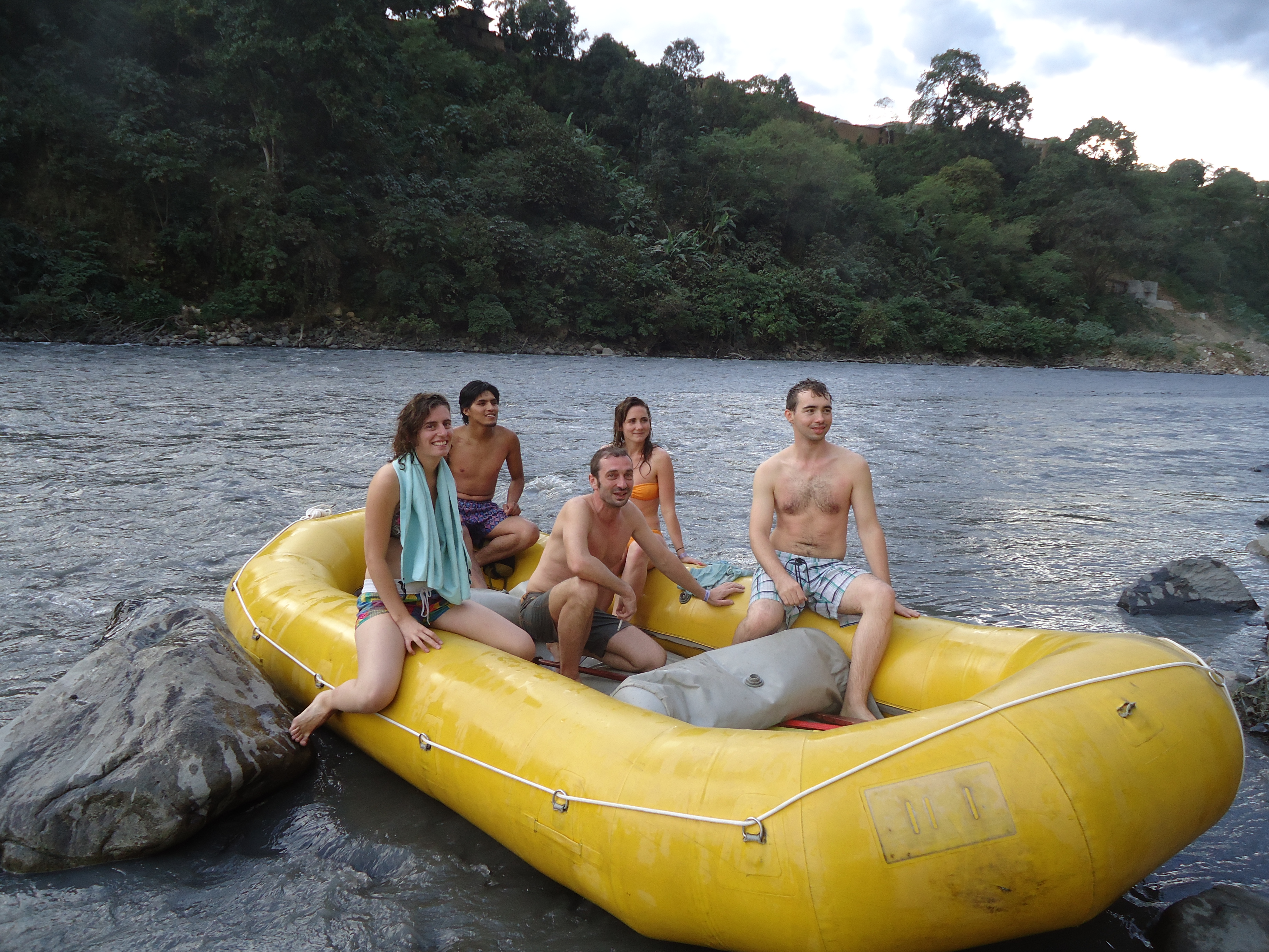 L’après-midi, après avoir déjeuné dans un petit restaurant, on embarque avec deux des Français pour du rafting. La rivière aux couleurs foncées, descend rapidement, tellement rapidement qu’au bout de cinq minutes nous voilà par-dessus bord. Tous ?? Non, un brave gaillard résiste encore et toujours à la force de l’eau, seul dans le bateau Corell se sent au moins aussi perdus que nous. Mais pas de panique, deux canoës nous accompagnent, et en moins de cinq minutes nous voilà, tous à bord. On continue sous les rires des deux guides à bord des canoës, charriant le troisième guide qui pour la première fois dans sa carrière a réussi à passer à l’eau !! La suite de la descente se fait, beaucoup plus calmement.
