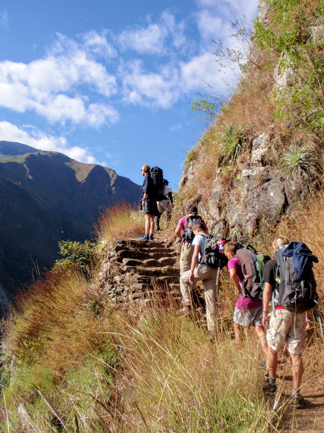 Au matin, avec des peintures Incas sur le visage, on commence l’un des chemins de l’inca, car il y en plusieurs, des petits sentiers vertigineux qui mènent au Machu Picchu. Les pentes sont effrayantes, on enchaîne les montées et les descentes, ainsi que les traversées de petits ponts de bois. Nous enchaînons les 16 km de cette journée. La vue est grandiose, sur la rivière dans la vallée et sur les montagnes alentour ! Le guide nous raconte des histoires en quechua, et fait quelques prières dans cette belle langue ! Bien-sûr on y comprend rien, mais ça nous plonge tout de suite sur les traces de ses ancêtres.
